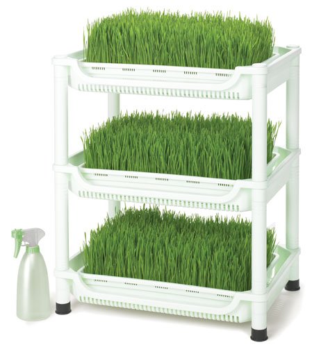 - Includes 3 each greenhouse covers, germinating lids, growing trays, seed sheets, shelf baskets, plus spray bottle and 1-pound organic wheatgrass seed